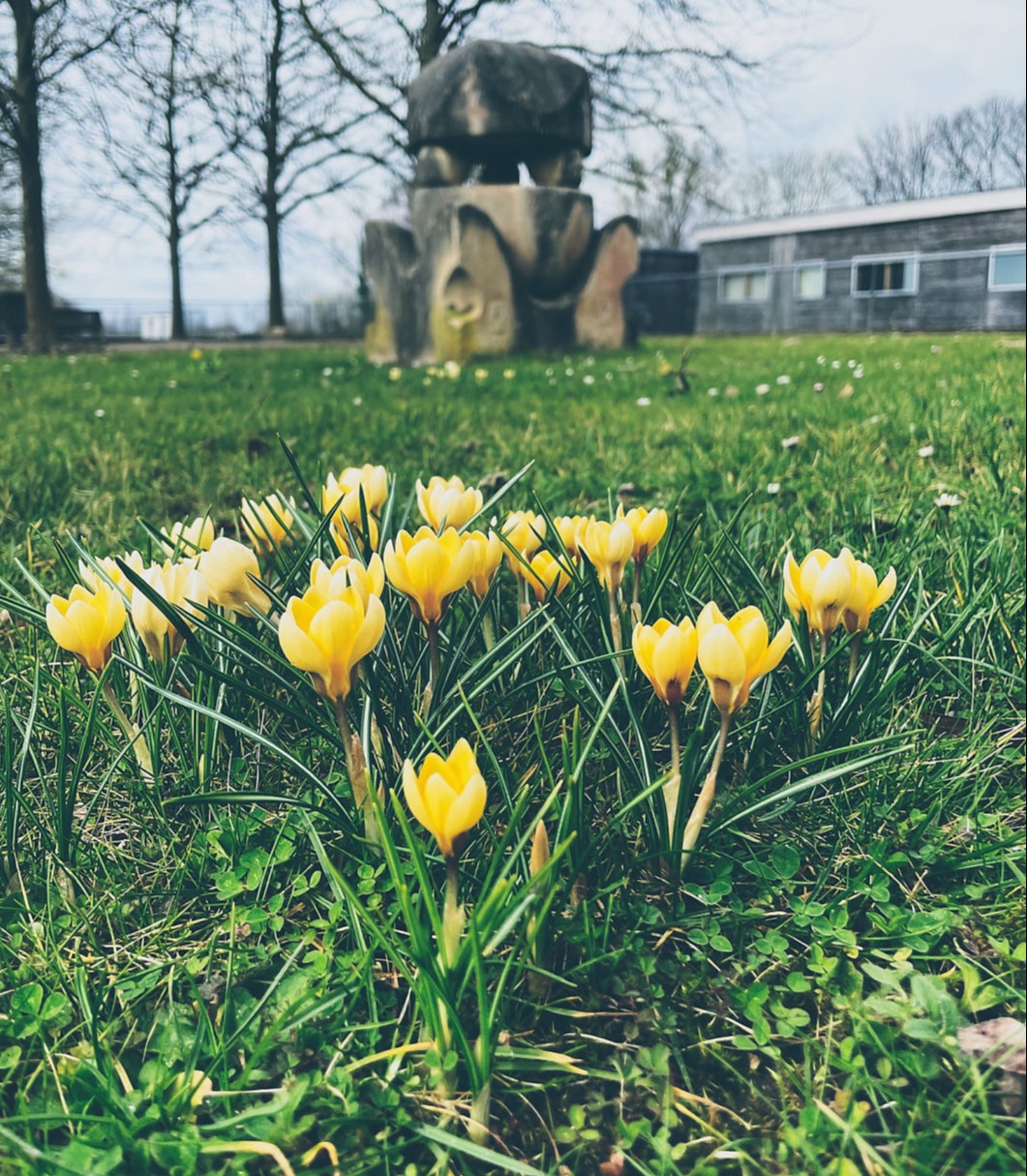 Variierte Platzierung: Für einen natürlicheren Look pflanze die Krokusse in kleinen Gruppen oder verstreut über die Rasenfläche.