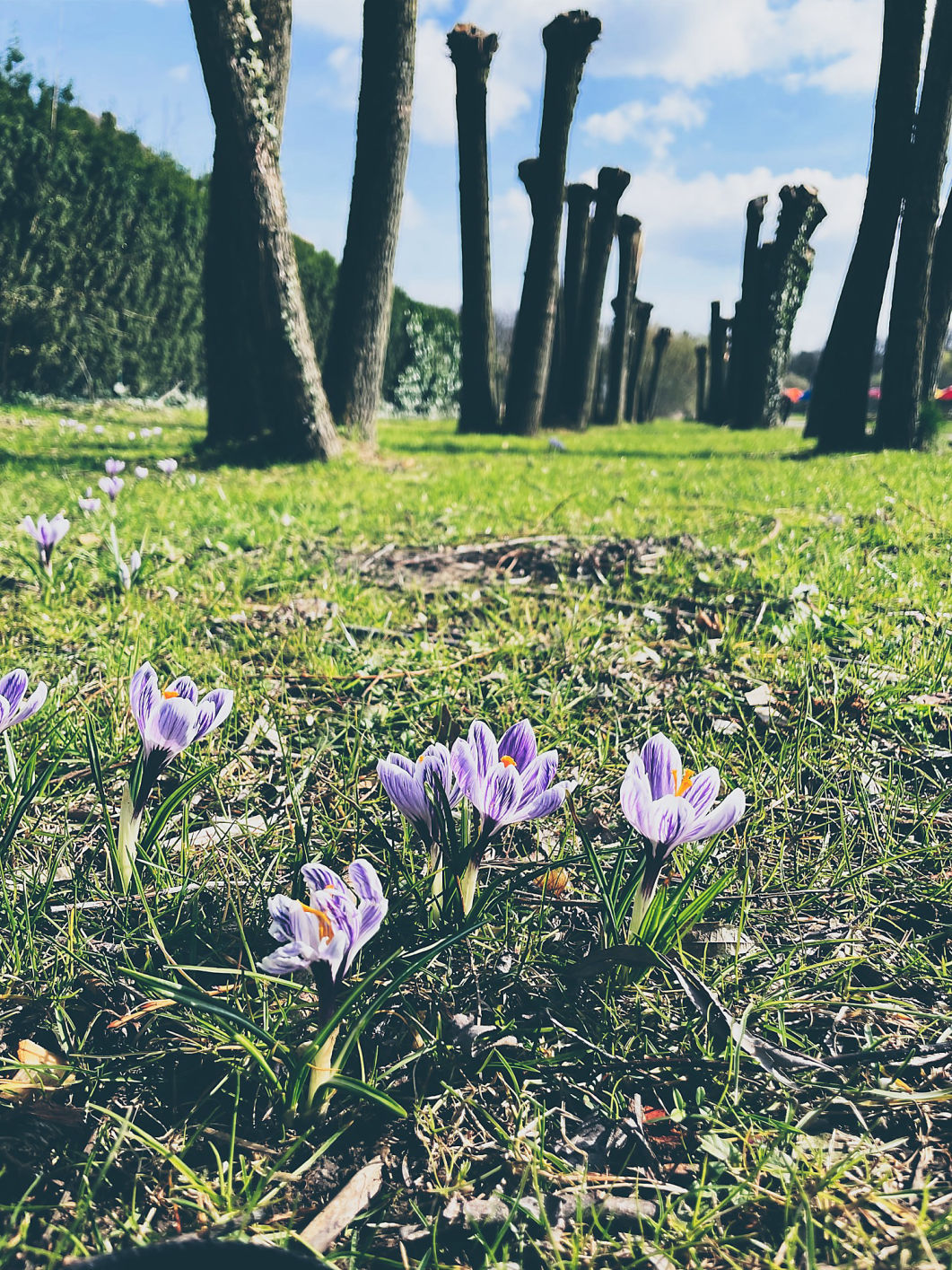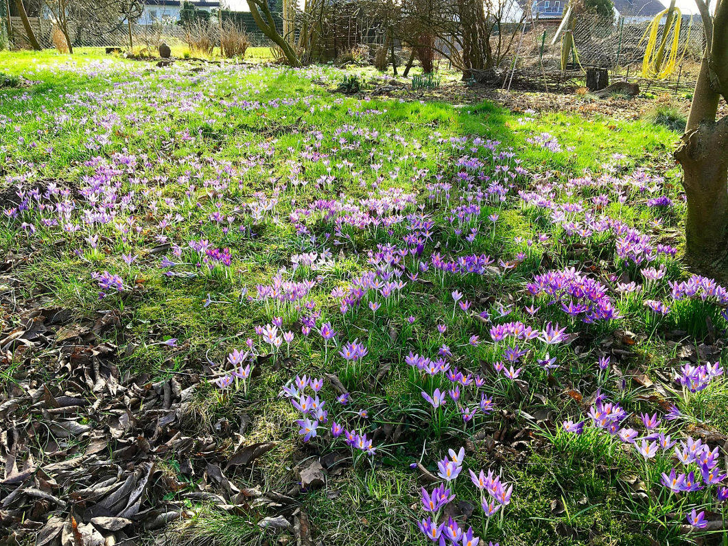 Rasenpflege: Warte mit dem ersten Rasenmähen im Frühling, bis die Krokusse verblüht sind und ihre Blätter vergilben. Dies ist wichtig, damit die Pflanze Energie in die Zwiebel zurückführt und im nächsten Jahr wieder blühen kann.